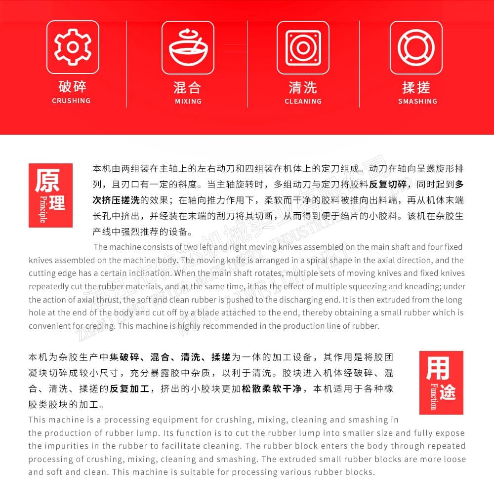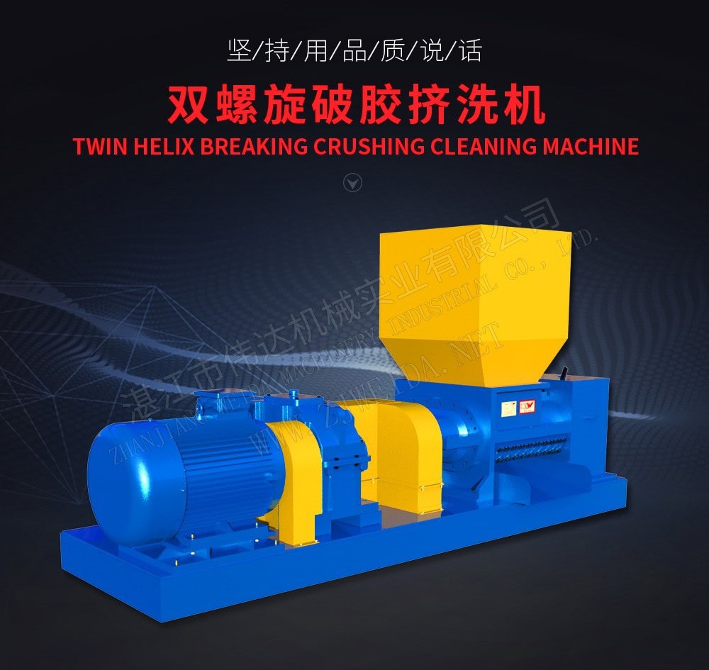 雙螺旋破膠擠洗機(jī)為雜膠生產(chǎn)中集破碎、混合、清洗、揉搓為一體的加工設(shè)備,其作用是將膠團(tuán)凝塊切碎成較小尺寸,充分暴露膠中雜質(zhì),以利于清洗。膠塊進(jìn)入機(jī)體經(jīng)破碎、混合、清洗、揉搓的反復(fù)加工,擠出的小膠塊更加松散柔軟干凈,本機(jī)適用于各種橡膠類膠塊的加工。